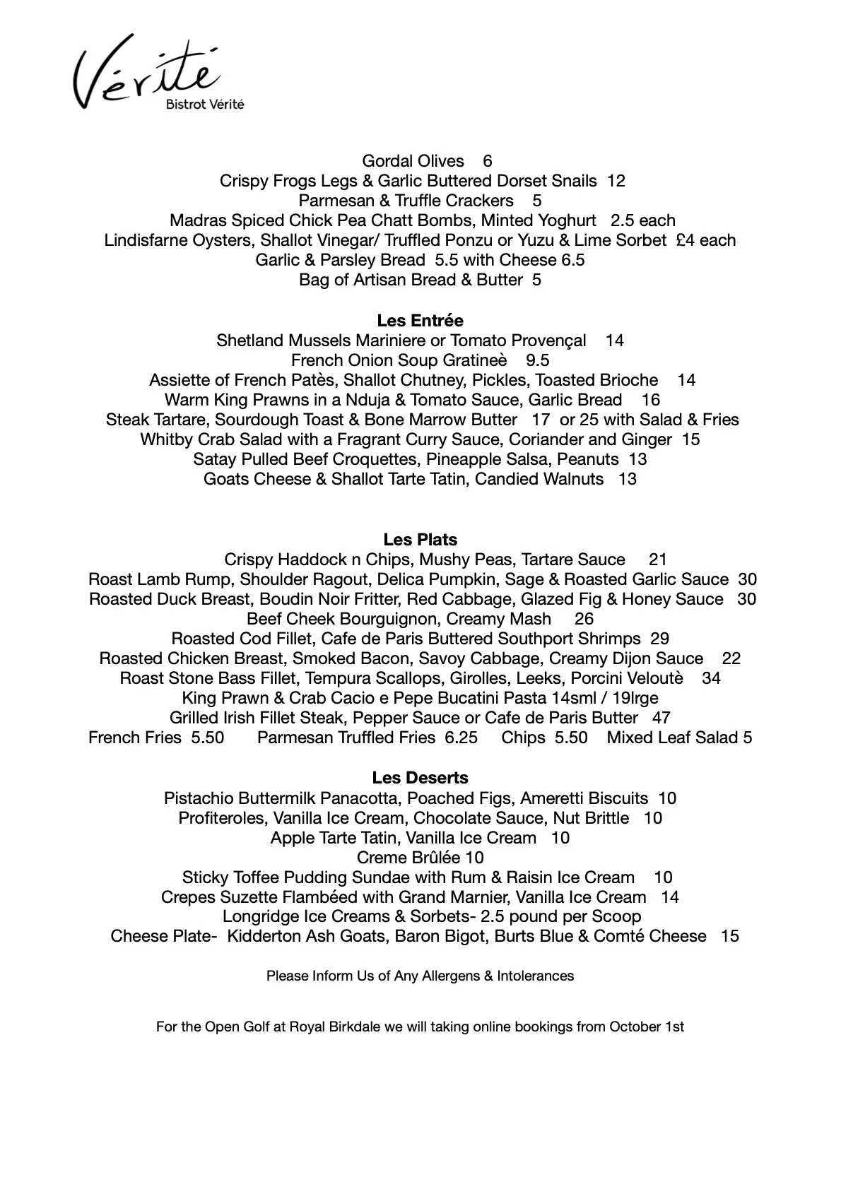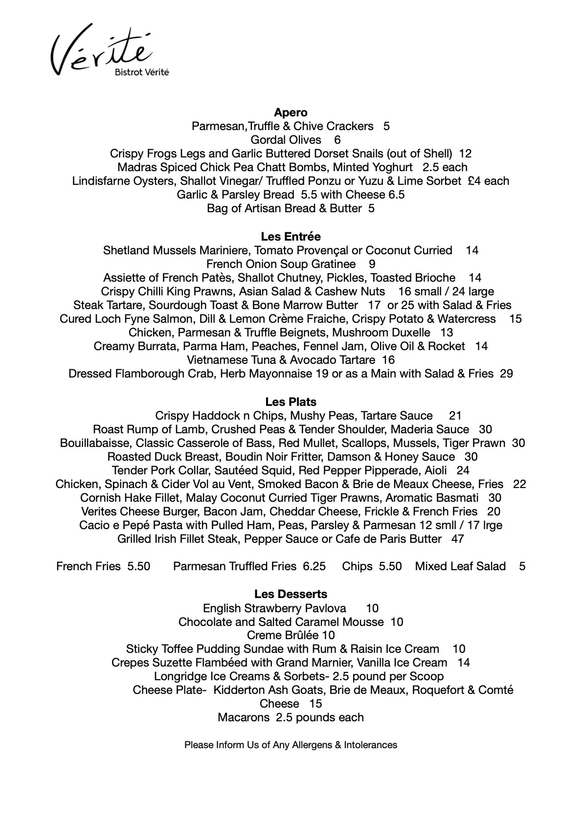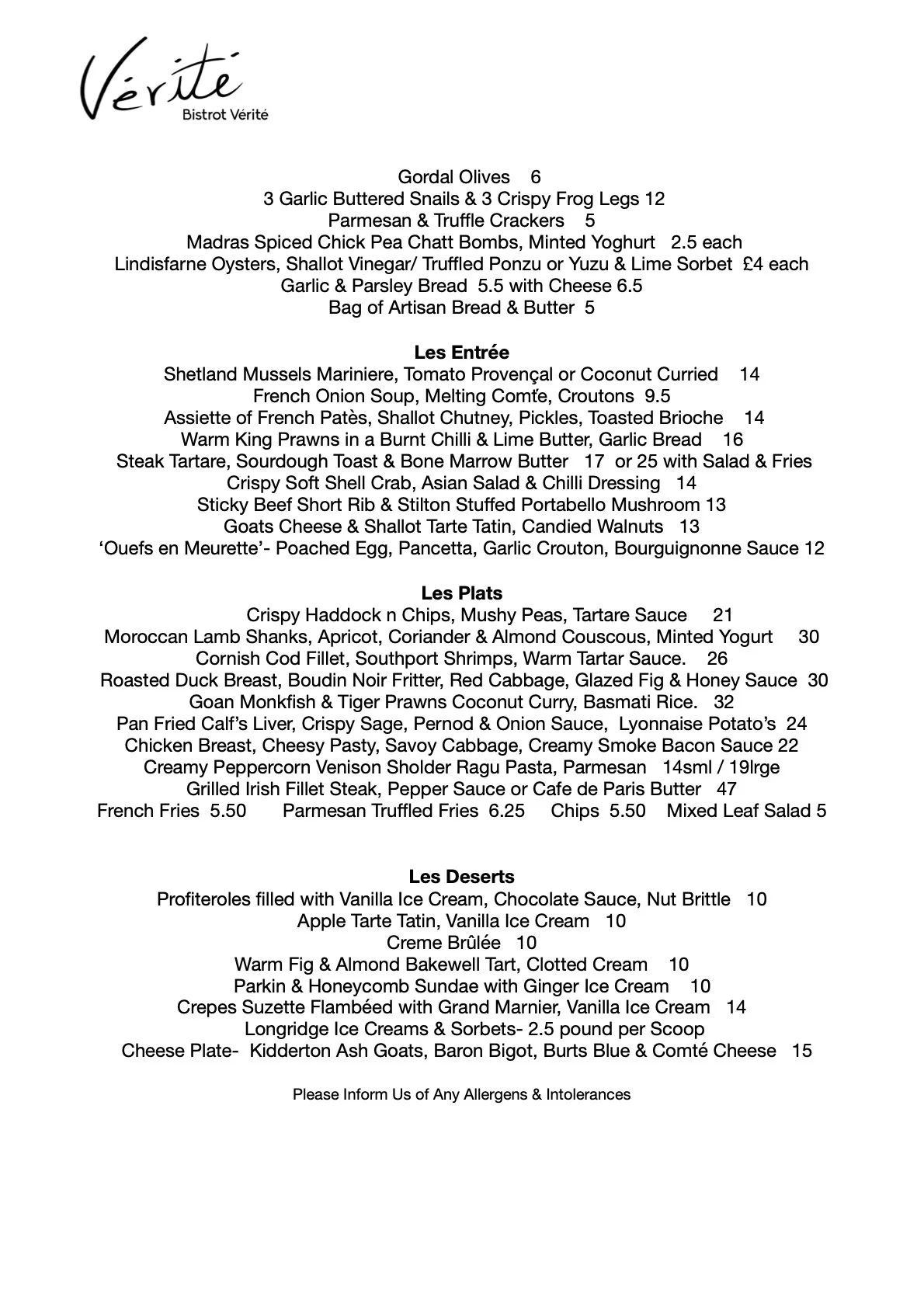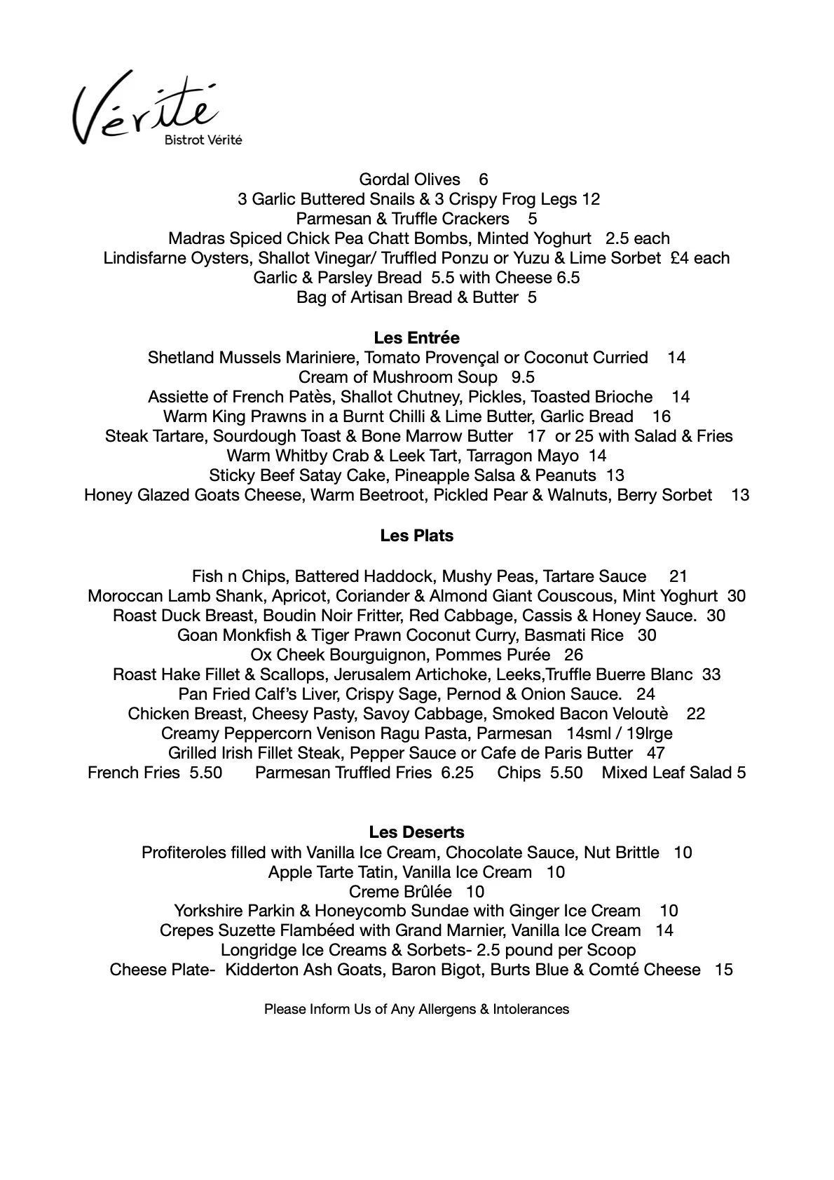 At Bistrot Vérité, our menus change daily — inspired by the freshest seasonal produce and what’s tasting best that morning. Each day’s selection is crafted by our chefs to reflect the spirit of classic French dishes and Worldwide cuisine, with a focus on bold flavour, quality ingredients, and a touch of creativity.